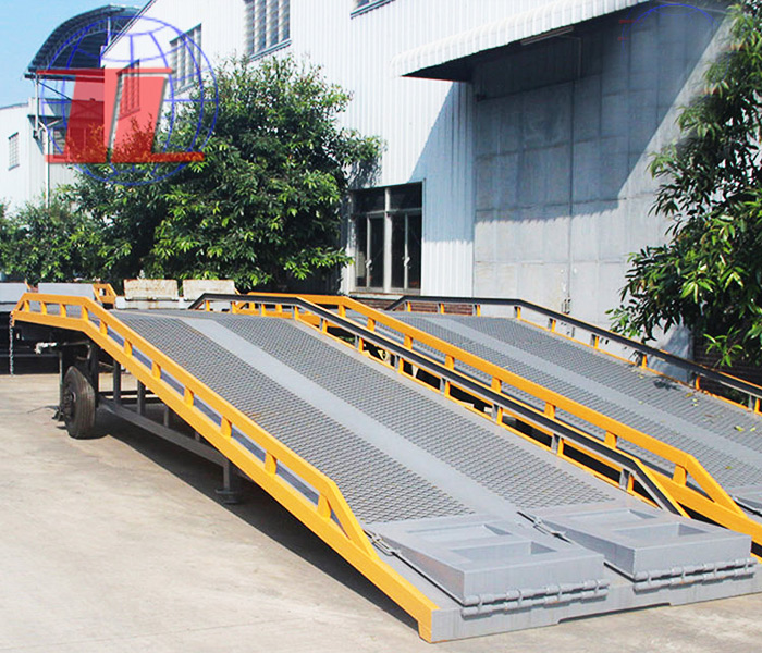 移动式登车桥广泛用于无装卸设备的货台及流动装卸场所,是与叉车配合使用的货物装卸辅助设备。借助移动式登车桥,叉车能直接驶入汽车集装箱内部进行批量装卸作业。只需单人操作,不需动力电源,即可实现货物的安全快速装卸